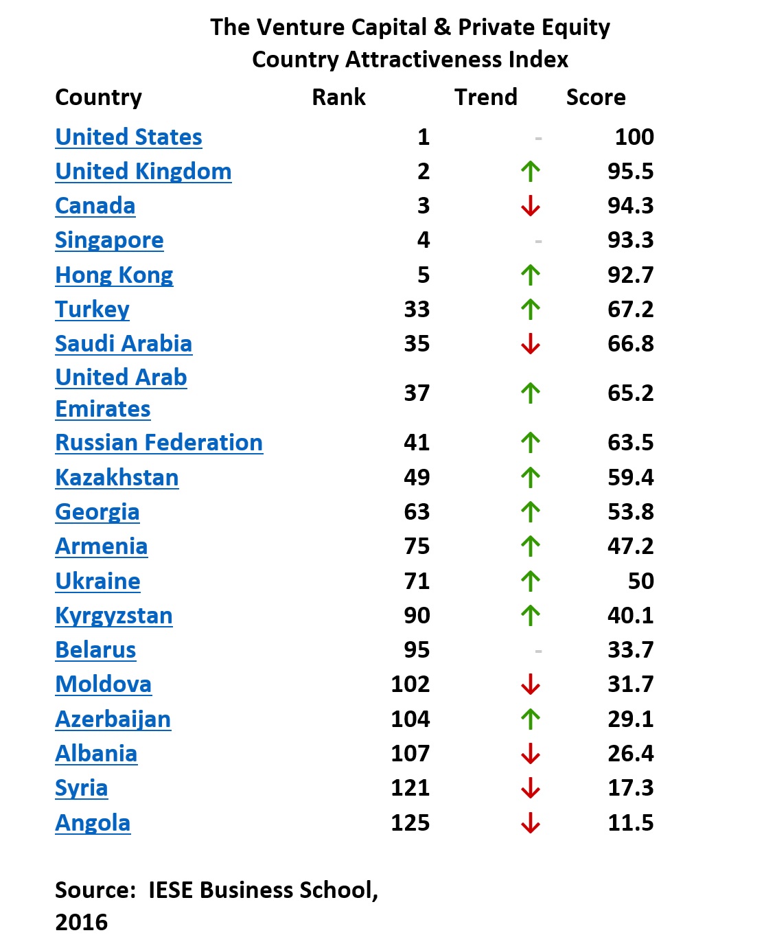 By this measure, Central Asia and Caucasia are not even on the radar of the PE Industry. The most advanced in the region is Kazakhstan. It is ranked 49th in the Venture Capital and Private Equity Attractiveness Index 2016 (the index developed by two prominent business schools). The Index ranks 125 countries by several criteria measuring their investment and business environment and attractiveness to the PE industry. As per the same index, Georgia is ranked 63rd, Ukraine 71st, Armenia 75th, Kyrgyzstan 90th, Azerbaijan 105th. Russia is ranked 41st while Belarus is ranked 95th in the same Index.
